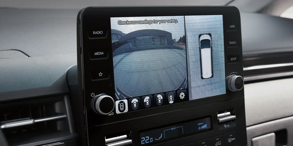 La Staria Pasajeros incluye una cámara de reversa que facilita las maniobras de estacionamiento, mostrando el entorno trasero en la pantalla y ajustando las guías según el movimiento del volante para mayor precisión.