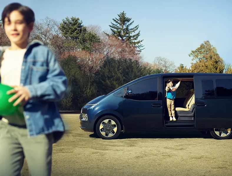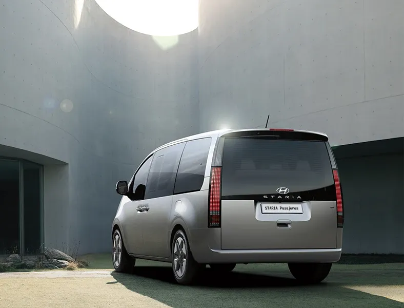 La Staria Pasajeros incluye una cámara de reversa que facilita las maniobras de estacionamiento, mostrando el entorno trasero en la pantalla y ajustando las guías según el movimiento del volante para mayor precisión.