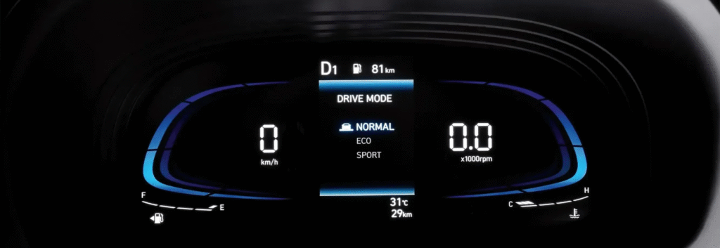 Tablero digital de 4,2 pulgadas que muestra alertas de seguridad activa y pasiva en alta definición.