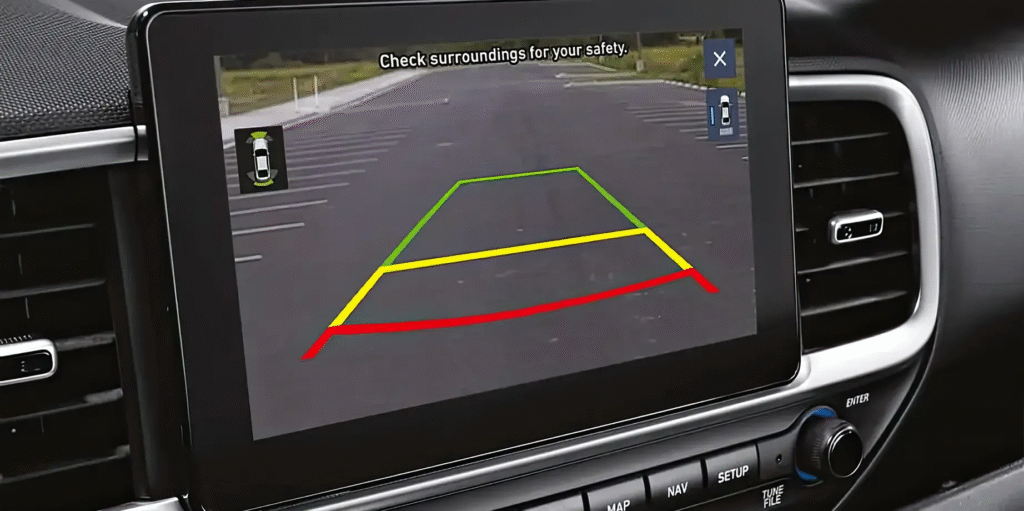 La cámara de reversa proyecta guías dinámicas en pantalla para facilitar el estacionamiento seguro.